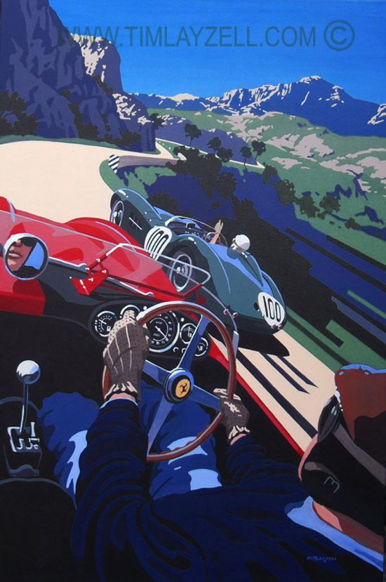 Driving an Aston Martin DBR1, Stirling Moss gives his customary wave to Peter Collins as he passes the latter’s Ferrari 250 Testa Rossa as they power across the tortuous mountains of the Targa Florio course during the 1958 running of the classic race. Moss was regarded as perhaps the greatest sportscar racer of all time but Collins was no slouch – and had partnered Moss to win the Targa in the Mercedes 300 SLR in 1955. On this occasion, Moss was out of luck, retiring the semi-works Aston with gearbox trouble while Collins went on to finish 4th, partnered by Phil Hill. |