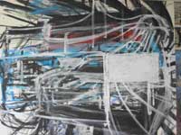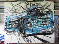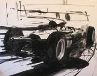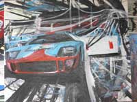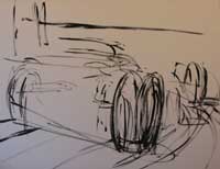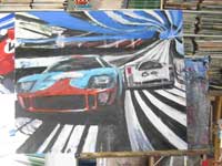 Although the finished painting has a simplified appearance, the ‘pop-art’ style is in fact very complex. As you can see, each picture starts in draft form as a rough sketch in paint before being steadily refined. Each line has to be in the correct place in order to achieve the sense of speed and perspective while retaining a ‘clean’ appearance